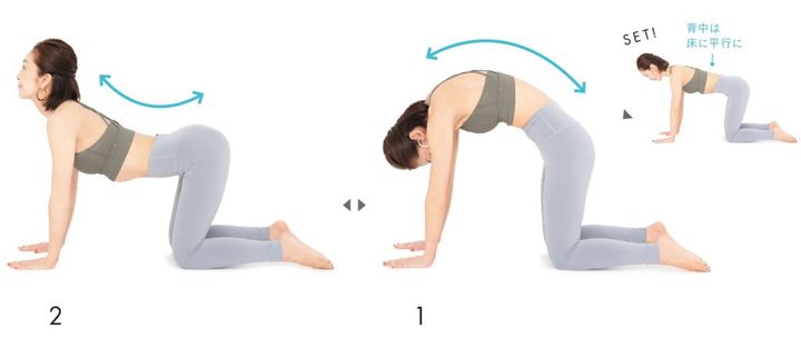 1、肩幅に手を開き、肩の真下に手をつく。膝は腰幅に開く。一度息を吸い、息を吐きながらおへそを覗き込むように背中を丸める。
