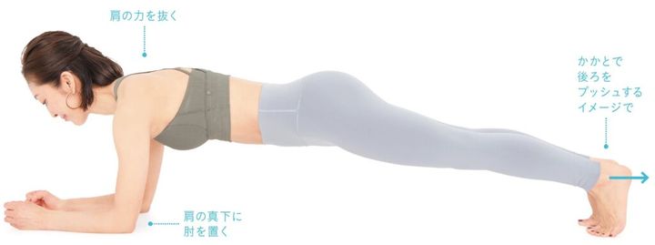 うつ伏せになり、肩の真下に肘がくるように腕を肩幅に開き、肘を床につける。つま先を立てて、かかとで後ろの壁を押すようなイメージで頭からかかとまで一直線になるように腰を浮かせた状態を20秒間キープ。