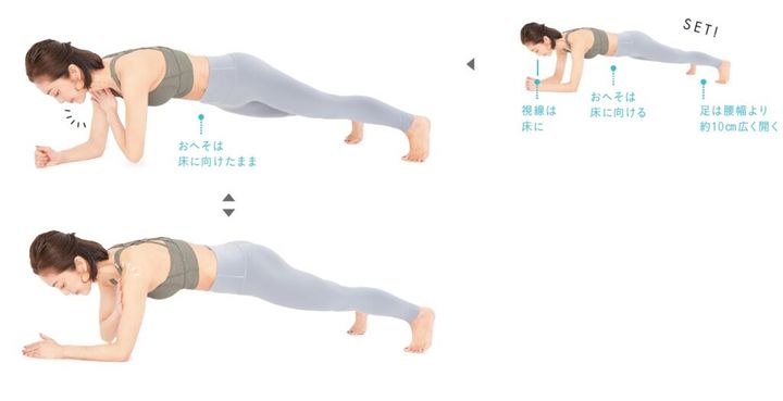 うつ伏せになり、肩の真下に肘がくるように腕を肩幅に開き、肘を床につける。つま先を立てた状態で、左手で右肩をタッチしていったん腕を戻し、続けて右手で左肩をタッチ。これを繰り返す。負荷がかかりすぎる場合は、足を広めに開くとよい。逆に慣れてきたら足を狭めるとより負荷がかかる。