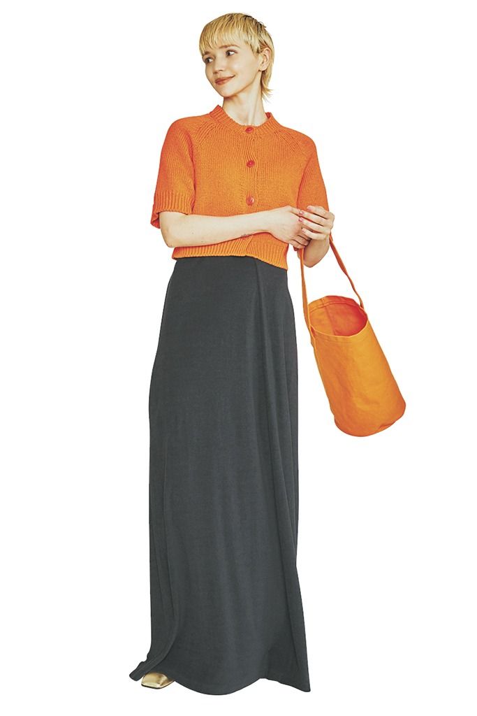 オレンジと相性のいいネイビーのドレスワンピースの上から重ねた究極シンプル。バッグも同系色でリンク。フロントボタンつきの短め丈+半そでのクルーネックニットはアウターの中に仕込んでも、羽織っても、1枚でも着られる使い道の多い1着。