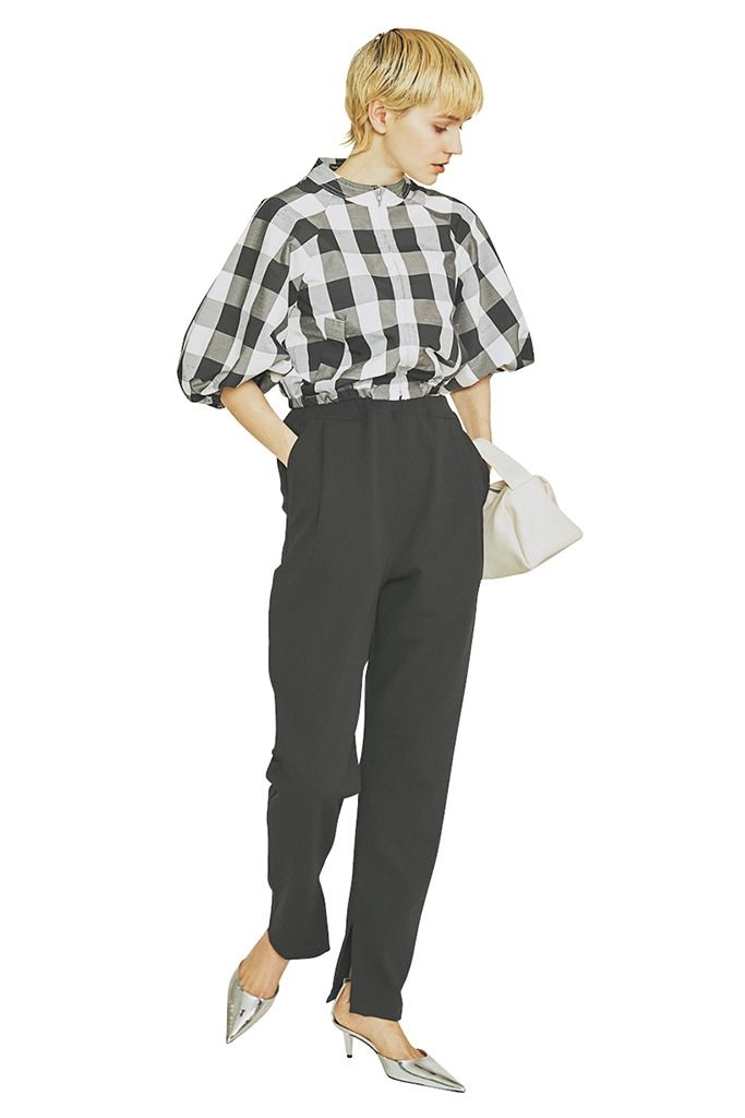 ボリュームと相まってレディな印象のブルゾンは、逆三角形なシルエットにまとめて。メタリックサンダルで足元もシャープに。 タックイン不要だとブルゾンもボリュームデザインが選びやすい。大きいブロックチェックの膨張感が気にならなくなる利点も。