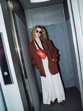 ブラウンワイドジャケット 67,100円/ソフトハイフン 生成りキャミワンピース 37,400円/Graphpaper(グラフペーパー 東京) サングラス 26,400円/THE BEDFORD HOTEL(キングスター) バッグ 6,820円/BATTLELAKE OUTDOORS(メイデン・カンパニー) ミュール 35,200円/PIPPICHIC(ベイジュ)