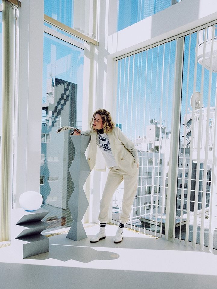 白ダブルボタンジャケット 46,200円/セテンス 白Tシャツ 13,200円/バウム ウンド ヘルガーデン(エディット フォー ルル) 中に着た黒タートル 16,500円/någonstans アイボリースエットパンツ 24,200円/SOFT GOODS(メイデン・カンパニー) 眼鏡 24,090円/Ray-Ban(ルックスオティカジャパン カスタマーサービス) ソックス 1,452円/ユナイテッドアスレ(キャブ) ローファー 137,500円/ジェイエムウエストン(J.M. WESTON 青山店)