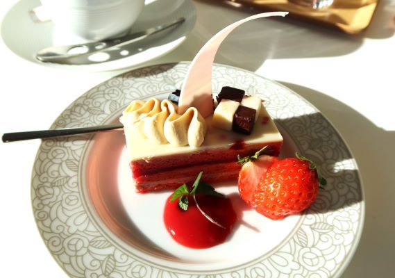 旧朝香宮邸を読み解く A to Z企画展カフェデザート、ホワイトチョコレートと木苺のオペラ仕立て café TEIEN(カフェ庭園)
