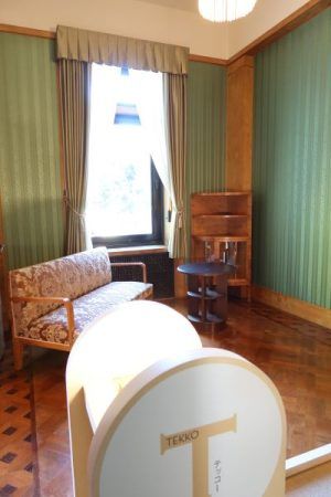 正面玄関を入って左側の第一応接室も公開中で、中に入ることが出来ました。キーワードは"T"、TEKKO(テッコー)。 落ち着いた雰囲気の室内は、TEKKO(テッコー)のグリーンのストライプの壁紙が。竣工当時の品番や色味も近いものが生産可能だったことから、1994年(平成6年)に再現されたものだそうです。