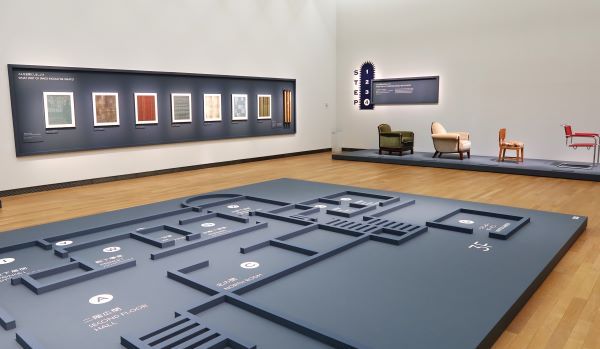 新館ギャラリー1には、床一面のに旧朝香宮邸の見取り図と、部屋ごとに使われた室内装飾の素材が展示されていました。