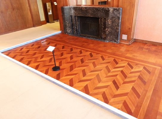 普段は文化財保護のためカーペットで覆われた床の一部が公開されていました。高級木材で組まれた矢羽根(やばね)模様の美しい寄木(よせぎ)床です。 重厚感のある大理石のマントルピースをアーチが挟んで、直線と曲線のコントラストが大広間の空間にリズム感を作っています。
