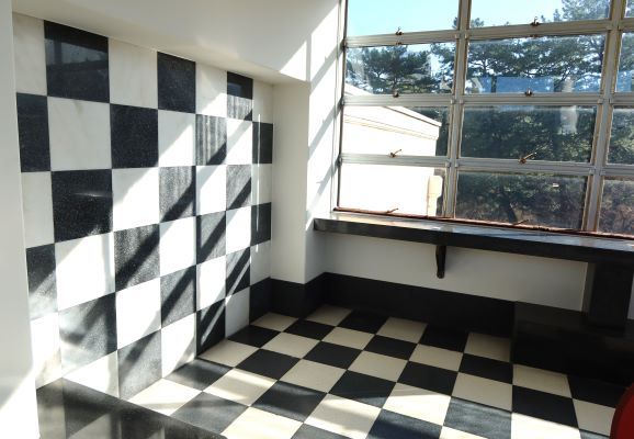 市松模様のモダンな内装が洒落た雰囲気のウインターガーデン。本展期間中は特別公開されます。 旧朝香宮邸の最上階にあり、明るい日差しがいっぱいに降り注ぐ温かな室内は植物を育てるのにはとてもよい環境。