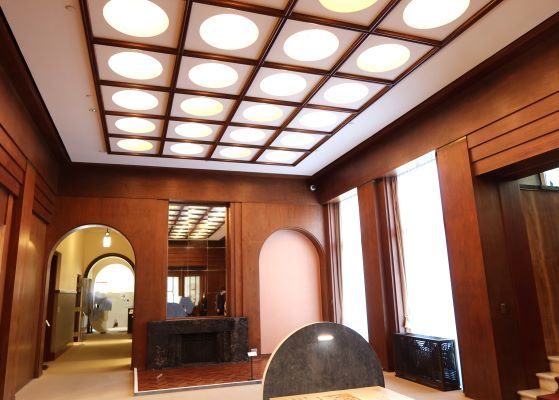 キーワード"U" UNEVEN HARMONYの大広間。四角い格子の中にある丸い電球が整然と並ぶ天井。アール・デコ様式で装飾されたラジエーターカバーも直線と曲線のデザインです。