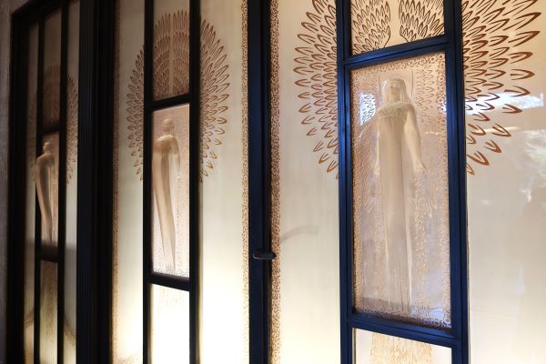 室内装飾の設計をしたアンリ・ラパン。シャンデリアや、ガラスレリーフを手掛けたルネ・ラリック。マックス・アングランが手掛けたのはエッチング・ガラス扉。ガラス扉の上部の半円形の装飾をデザインしたレイモン・シュブ。