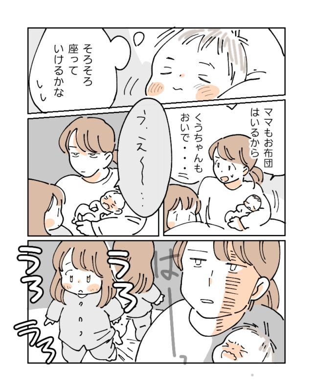 「ママもお布団はいるからくうちゃんもおいで・・」
