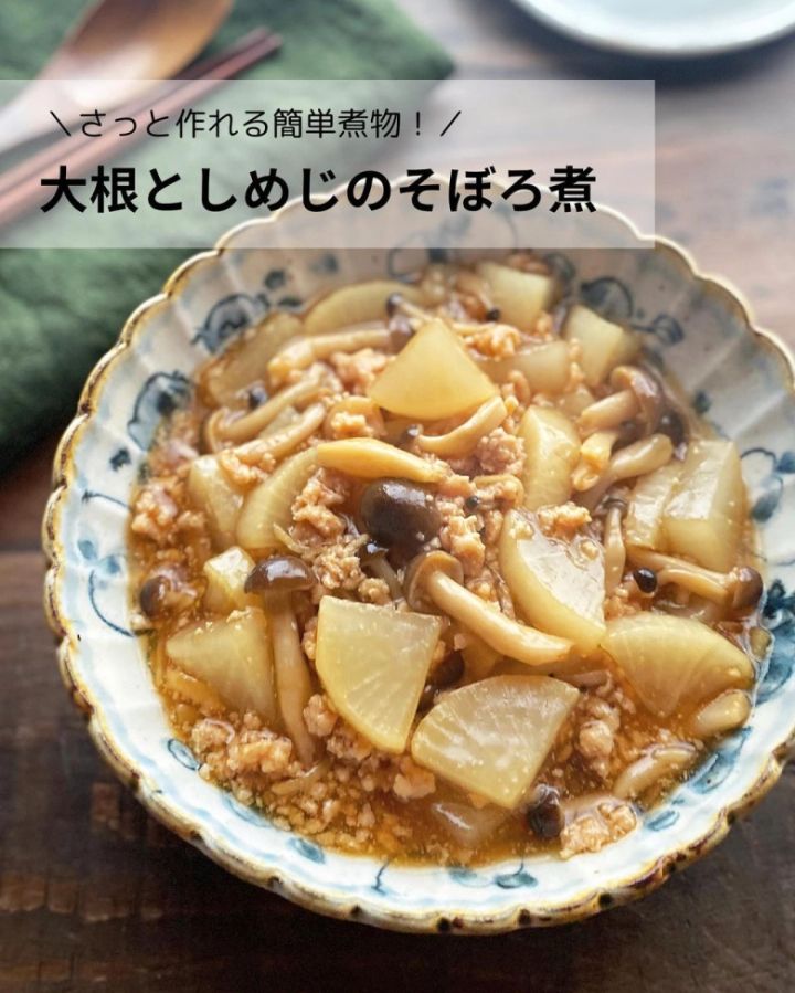 鶏ひき肉の出汁が染み込んだほっとする味わいの煮物。手間がかかるイメージの煮物も、野菜をあらかじめレンジで柔らかくすれば短時間で作れちゃうんです♪唐揚げに合わせれば、ほっこりした和食献立になります。とろみが付いているので、ご飯にかけてもおいしいですよ。
