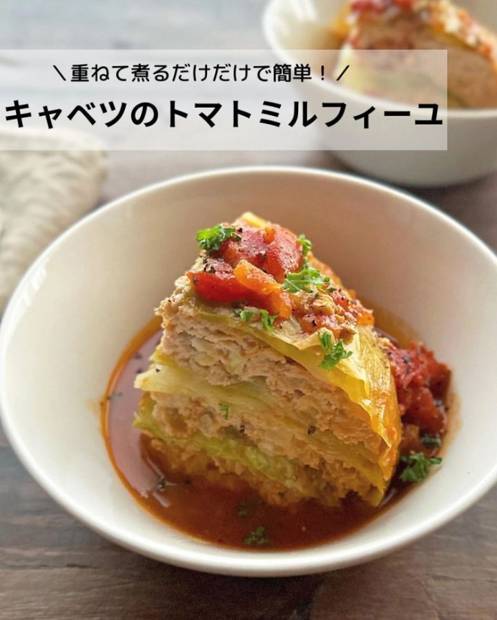 キャベツがモリモリ食べられるミルフィーユ煮。ひき肉とキャベツを重ねて煮るだけで簡単に作れます。春キャベツを使えば甘くなってより優しい味わいに。ボリューム満点にしたい唐揚げの時の献立にぴったりのメニューです。美しい断面と豪華な見た目に、テンションが上がること間違いなし!
