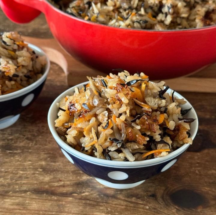 鉄分やカルシウムを多く含むひじきと、たっぷりの野菜が入った栄養満点の炊き込みご飯。多めに作って翌日におにぎりにしても良いですね。唐揚げの主食にすれば、不足しがちな野菜も補えて健康的ですよ。