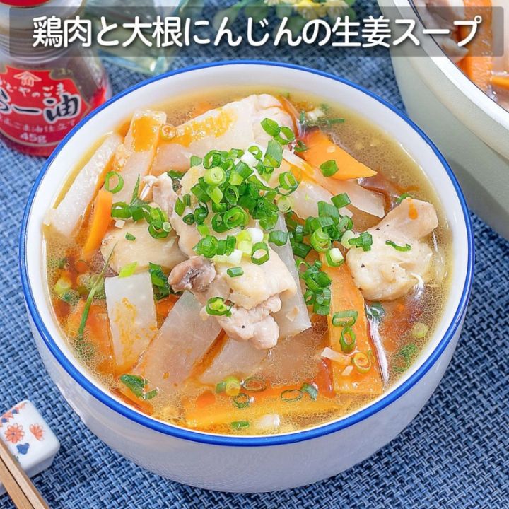 根菜と生姜、鶏肉を使ったスープ。根菜と生姜がたっぷり入っているので、カラダがポカポカに温まりますよ。爽やかな生姜の風味が鶏ガラベースのスープと相性抜群です。材料に鶏肉を使っているので、唐揚げに使用した鶏肉の残りを使って手軽に作れちゃいますよ。