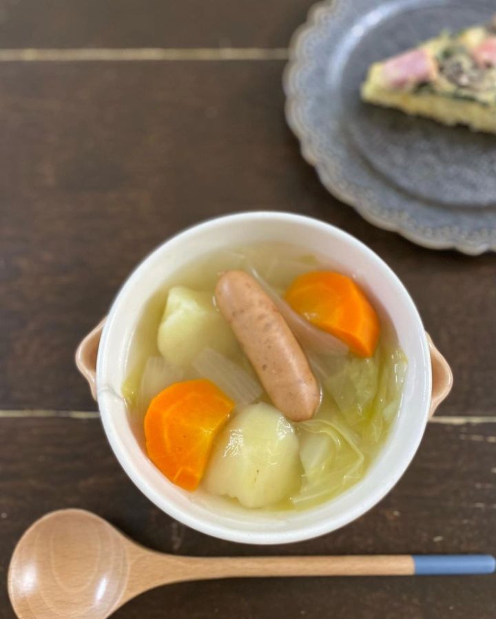 野菜がゴロっと入ったポトフ。手が込んでいるように見えるのに、材料を入れて煮込むだけで作れる簡単レシピ。食べ応えがあるので、唐揚げともう一品おかずが欲しいという時にぴったりです。揚げ物とウインナー入りポトフという組み合わせに、子供も喜びますよ♪