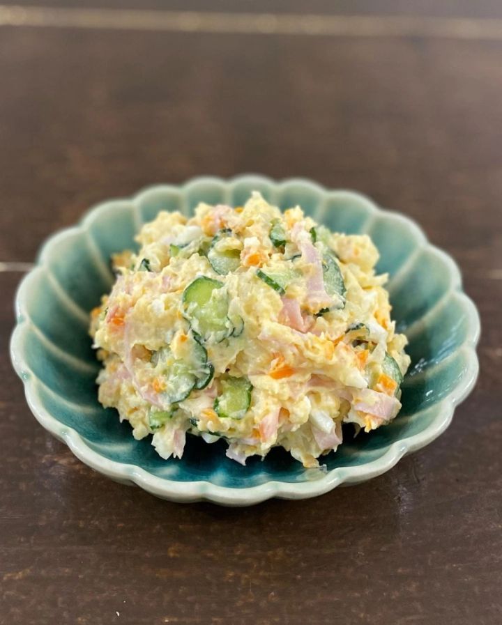 唐揚げに合わせる副菜の定番といえばポテトサラダ。じゃがいもやにんじん、玉ねぎをいっしょに茹でれば短時間で簡単に作れます。多めに作って、お弁当のおかずや常備菜としても◎