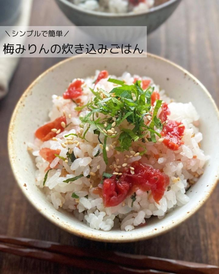 梅干しとみりん、白だしを加えて炊いた、シンプルな炊き込みご飯。仕上げに大葉やごまをあしらうことで風味もアップします。梅干しの酸味がさっぱりとした味わいなので、唐揚げの主食に最適です。