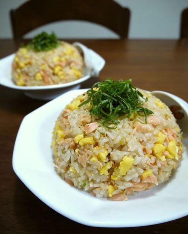 フワフワの炒り卵と鮭がたっぷり入ったチャーハン。唐揚げと組み合わせれば、まるで中華料理店の唐揚げ定食のよう♪鮭を電子レンジで加熱するので、臭みがなく仕上がりますよ。