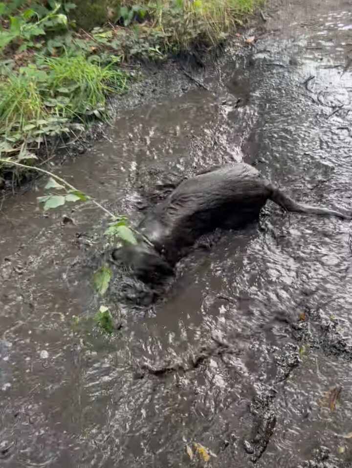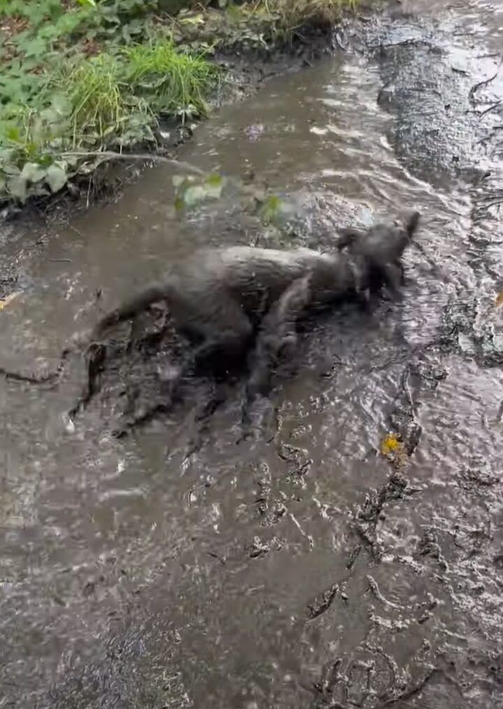 舗装もされていない場所なので、その水たまりはすっかりぬかるみになっていましたが、その中に飛び込んだ子がいるみたいです。