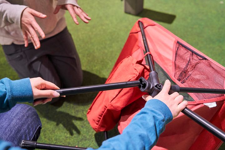 実際に組み立てる様子も見せてもらいました。天板を脚から外すだけなので、こちらも簡単に組み立てできそう。こうして組み立ての手順をチェックできるのも、リアルショッピングの醍醐味。せっかく買ったのに組み立てや片付けるのが面倒では、登場回数が減ってしまいそう…。ということで、ここも重要なチェックポイントです!