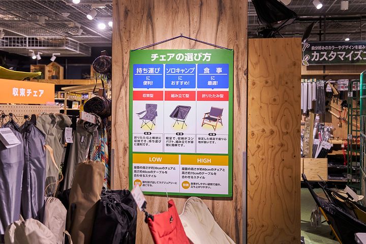 豊富なアウトドアチェアから自分の目的に合ったものを選ぶ手段として、参考になりそうなPOPを見つけました。チェアのタイプは、大きく「収束型」「組み立て型」「折り畳み型」の3つに分かれるとか。チェアリングにおすすめなのは、軽量で簡単にコンパクトにしまうことができる「組み立て型」だそうです。