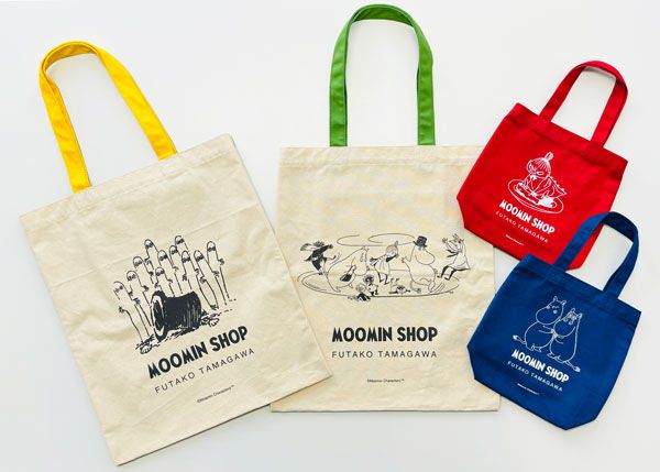 店舗限定品として毎回大人気のムーミンショップ ロゴ入りトートバッグ。キャンバスを彩るクレヨンのような、あざやかな色が目を引きます。二子玉川店では、定番サイズに加え、初となるミニバッグも登場します。