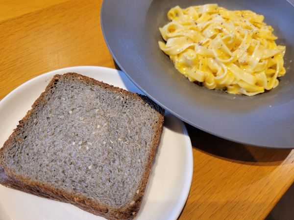カフェスペースでいただいた「生パスタランチセット」。パスタのおいしさはもちろん、このパンもごま感たっぷりでおいしかったです!