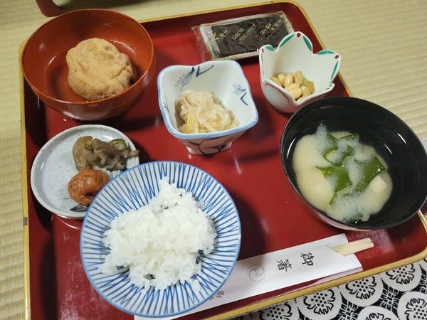 宿泊した宿坊の、精進料理の朝ごはん。朝ごはんの前には「朝のお勤め」にも参加しました。