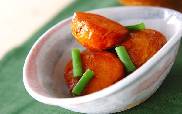 新ジャガイモを揚げてから煮ると、コクがプラスされてひと味違う味わいに。煮込むため、揚げるときは中まで火が通っていなくてもOKです。表面がキツネ色になるのを目安にしましょう。甘辛い味付けと照りが食欲をそそります。
