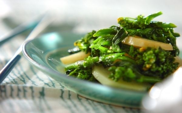 春に旬を迎える菜の花と新ジャガイモの炒めものは、鮮やかな色が目を引きます。新ジャガイモは薄切りにして食感よく仕上げましょう。ピリッと辛いショウガがアクセント。乾燥桜エビを加えても◎ですよ。