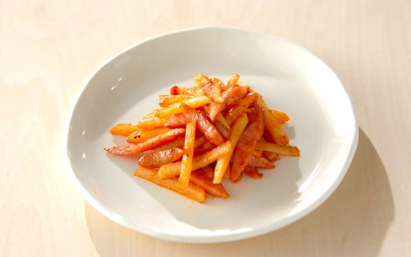 メインの材料は新じゃがいもとソーセージの2つだけ。あと1品ほしいときにパパッと作れる時短おかずです。火が通ったらケチャップをからめて出来上がり。10分で作れるので、お弁当にも良いですね。