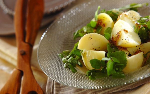 クレソンのほろ苦さと新ジャガイモがよく合うサラダ。白と緑のコントラストで華やかな印象です。新ジャガイモは皮ごと茹でて熱いうちに皮をむきましょう。皮の風味を味わいたい方は、皮ごと切ってもOKです。