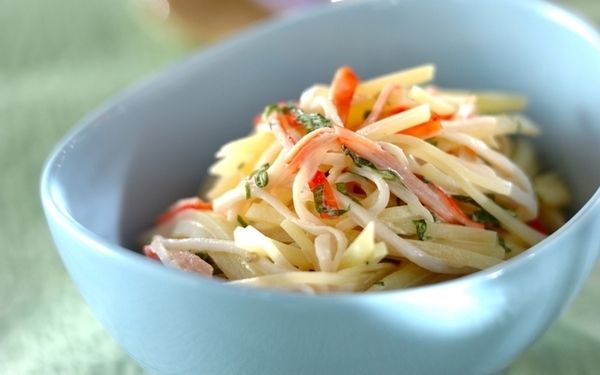 新ジャガイモはすぐに火が通るので、サッと茹でればOKです。こちらのレシピではせん切りにした新ジャガイモもを茹でてサラダにします。余熱でやわらかくなりすぎないよう、冷水に取ってくださいね。カニ風味カマボコや大葉などなじみのある食材で作れるのもポイントです。