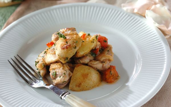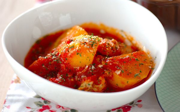 新ジャガイモはトマトと相性抜群です。鶏もも肉と一緒に焼いたら水煮トマトを加えて煮込みます。トマトの酸味と新ジャガイモのほんのりした甘さに箸が進むこと間違いなし。パルメザンチーズの代わりに余熱でピザ用チーズをからめても美味しいです。