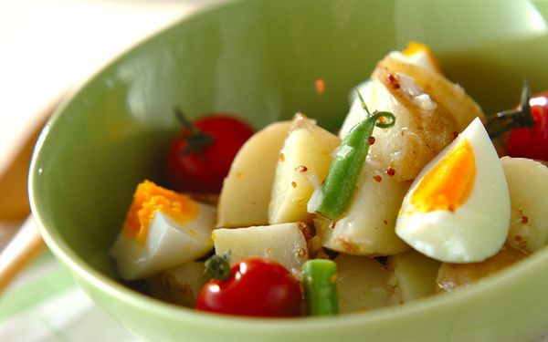 茹でた新ジャガイモを使ったサラダは、みずみずしい味わいが魅力です。同じ鍋でゆで卵を作るので時短にも節約にもなるのがうれしいですね。甘みがありやわらかな新玉ネギやハチミツ、りんご酢などで作ったドレッシングが爽やかです。ほど良いボリュームで副菜に喜ばれますよ。