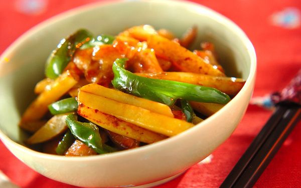 豆板醤や甜面醤を使ったピリ辛の炒めものは、ごはんにもお酒にもぴったりです。新ジャガイモは揚げてから炒めるのがポイント。香ばしさがプラスされるうえ、炒めても崩れにくくなりますよ。