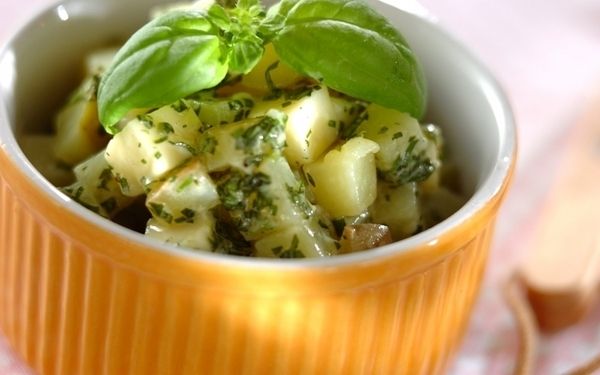 ジャガイモ料理の定番、ポテトサラダを新じゃがいもでアレンジ。新ジャガイモはやわらかいので短時間レンジにかけるだけでOKです。バジルの清涼感ある香りとチーズのコクが相まって、おつまみにも副菜にも喜ばれますよ。