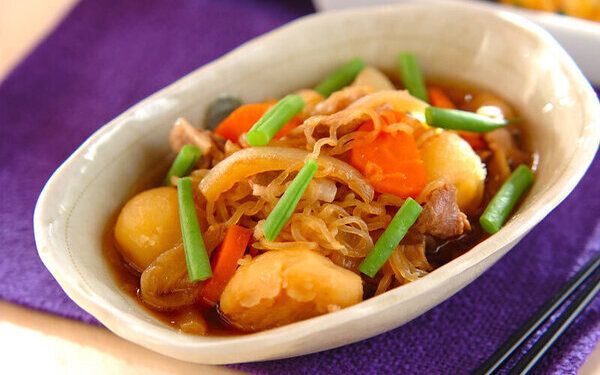 新ジャガイモの肉じゃがは、食卓に春を運んでくれますよ。レシピでは皮をむいていますが、皮ごと煮込むのもおすすめ。小さめの新ジャガイモなら、切らなくても良いです。煮る前に炒めるひと手間で新ジャガイモが崩れにくくなりますよ。