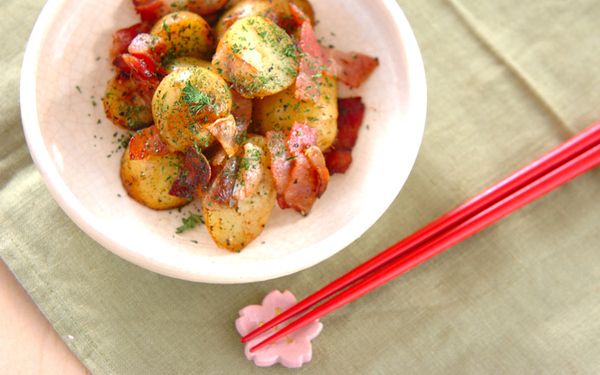 新ジャガイモでおつまみを作りたいときは、アンチョビとの組み合わせがおすすめ。ニンニクの香りとベーコンの旨みが新ジャガイモに行き渡り、絶品です。新ジャガイモはレンジ加熱しておくので、炒め時間が短く済むのも良いですね。