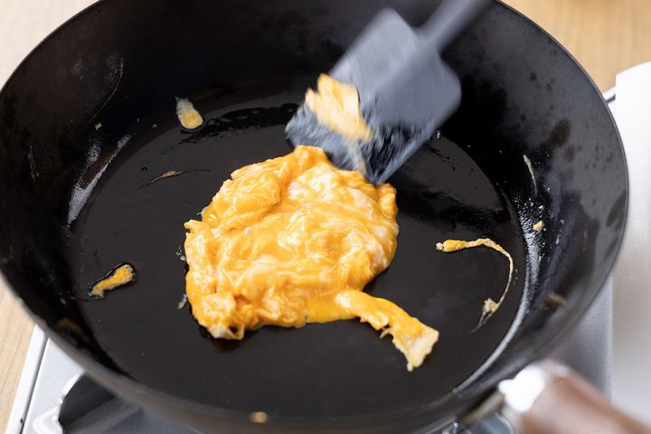 2. ごま油をひいたフライパンを強火で熱し、溶き卵を炒め、半熟になったら取り出す。