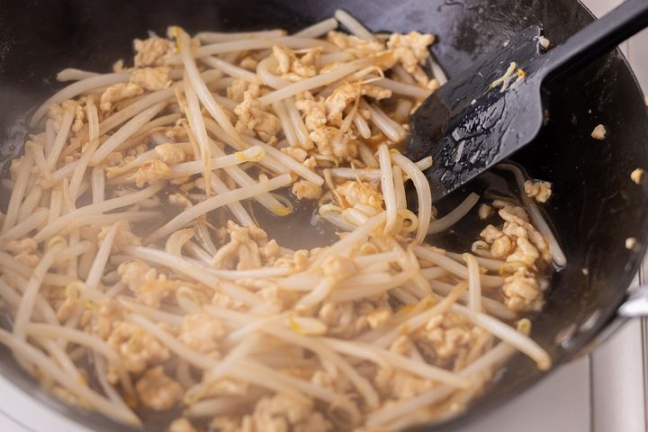 3. ごま油をひいたフライパンを中火で熱し、ひき肉を炒める。肉の色が変わったらもやしを加えてサッと炒める。