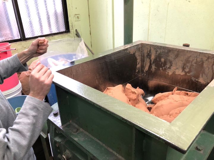こちらは、製造工程ででる削り数から粘土を作っているところです。