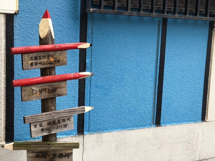 住宅街を歩いていると、鉛筆が大きく描かれた建物が見えてきます。ここが北星鉛筆の工場見学施設「東京ペンシルラボ」です。