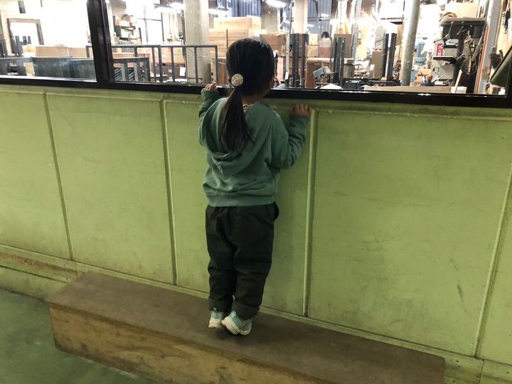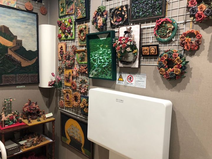 工場見学開始時刻までは、通路やトイレ(オムツ替え台付きの広いトイレなので、子連れでも安心です)に飾られた「もくねんさん」の作品を鑑賞したり、