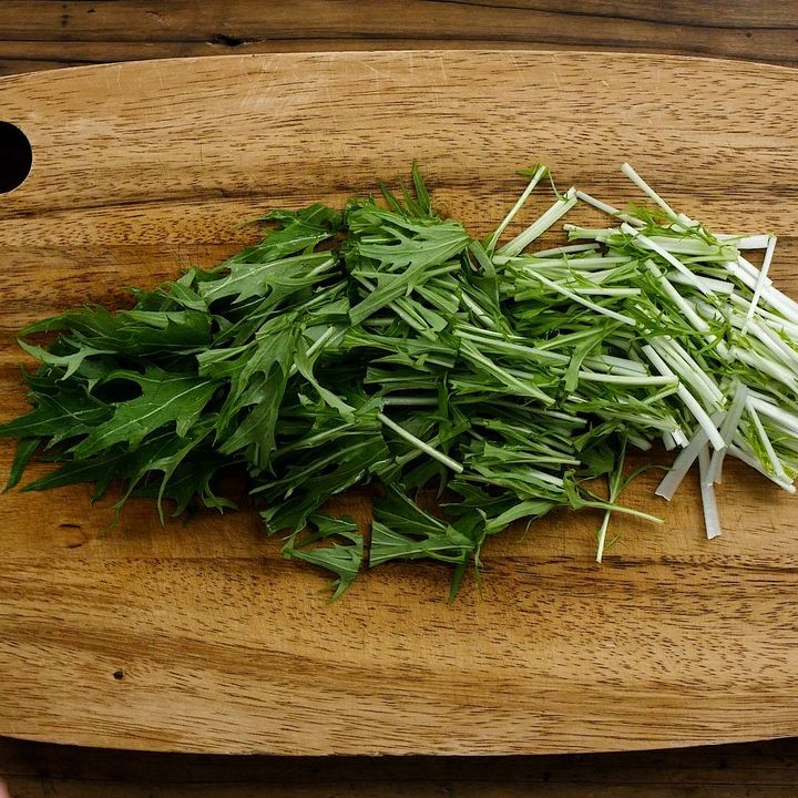 1: 水菜を2〜3cm幅に切り、ボウルに入れます。
