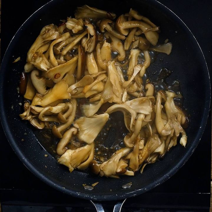 5: 軽く焼き色がついたら (a) を加え、よく絡めます。