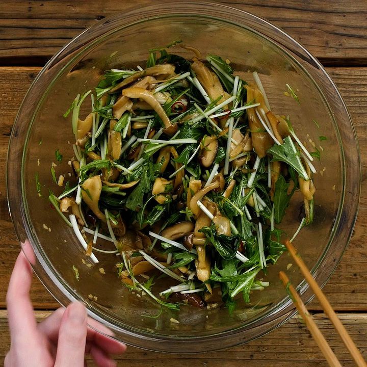 6: 軽く汁気が残った状態で①にうつし、水菜とよく混ぜ合わせたら完成です。