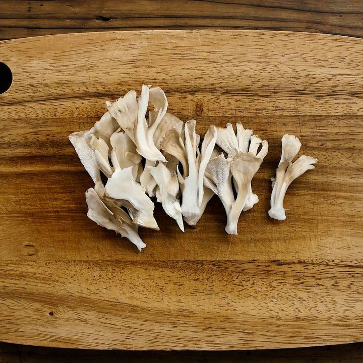 2: しめじとまいたけは小房に分け、しいたけは5mm幅の薄切りにします。しいたけの軸は細切りにします。
