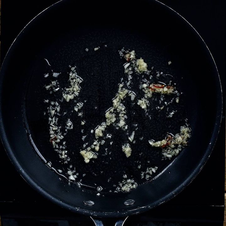 3: フライパンにごま油、にんにく、しょうが、輪切り唐辛子を入れて弱火で熱します。